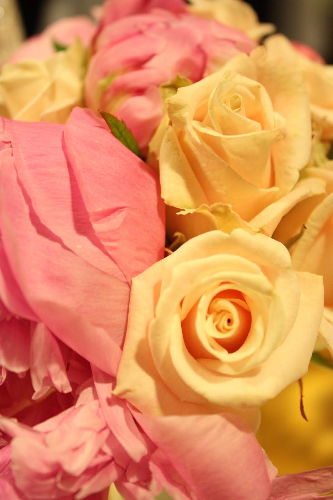 Brudebuketten; en skjønn forening av roser og peoner.
